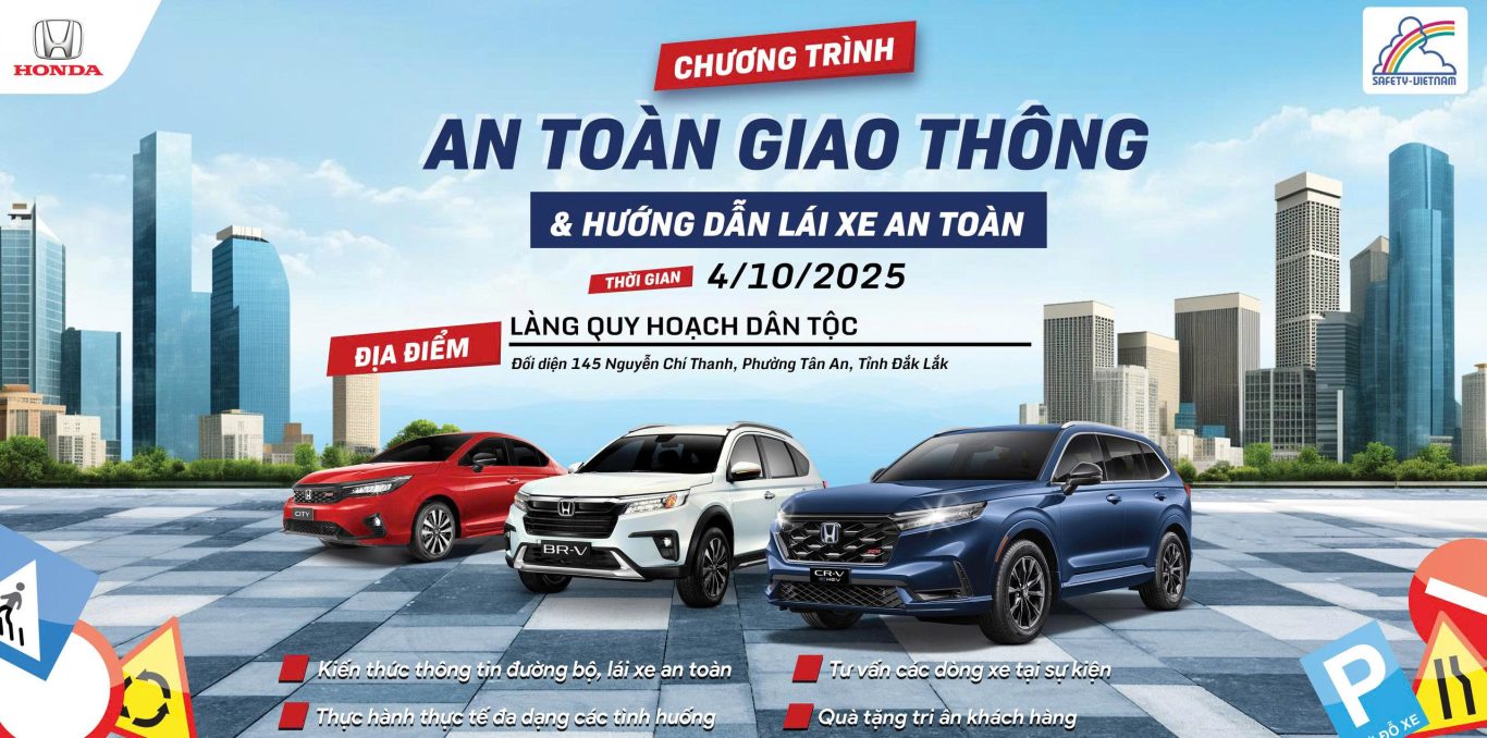 Để giúp khách hàng am hiểu rõ hơn về vấn đề An toàn giao thông và cách xử lý tình huống, phương pháp lái xe khi tham gia lái xe trên đường. Ngày 04/10/2025, Honda Ôtô Đắk Lắk – Buôn Ma Thuột tổ chức chương trình Lái Xe An Toàn tại Khu Quy hoạch làng dân tộc, bãi Đất trống đối diện 145 Nguyễn Chí Thanh, phường Tân An, Tỉnh Đắk Lắk