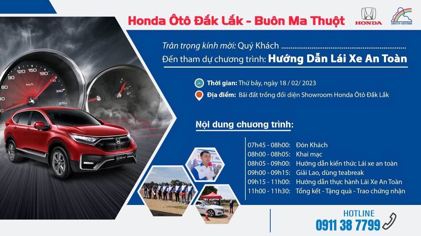 Để giúp khách hàng am hiểu rõ hơn về vấn đề An toàn giao thông và cách xử lý tình huống, phương pháp lái xe khi tham gia lái xe trên đường. Ngày 18/02/2023, Honda Ôtô Đắk Lắk – Buôn Ma Thuột tổ chức chương trình Lái Xe An Toàn tại bãi Đất trống đối diện 145 Nguyễn Chí Thanh, Tp Buôn Ma Thuột