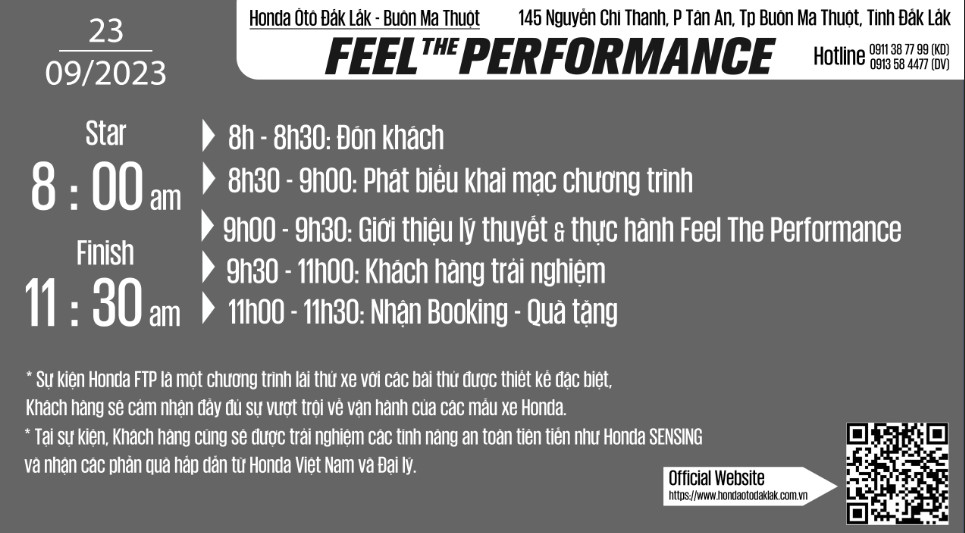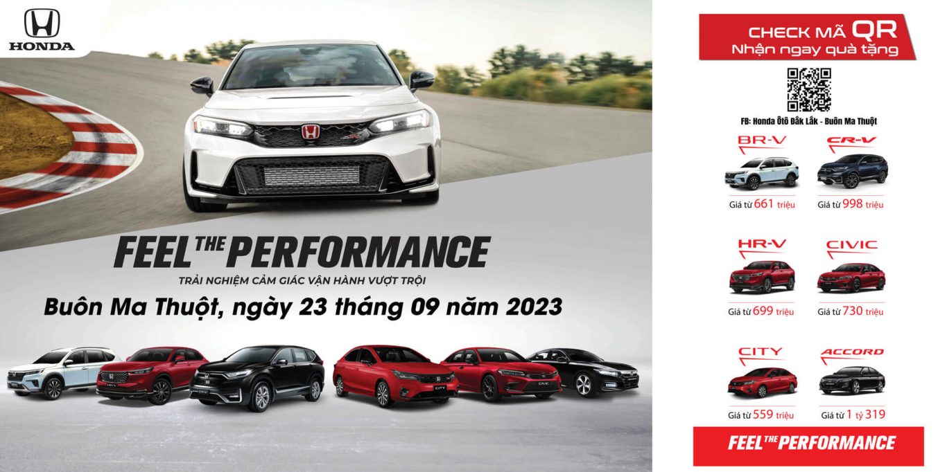 Ngày 23/09/2023 , Honda Ô tô Đắk Lắk – Buôn Ma Thuột tổ chức chương trình “Feel The Performance” tại bãi đất trống đối diện 145 Nguyễn Chí Thanh, Phường Tân An, Tp Buôn Ma Thuột, Tỉnh Đắk Lắk